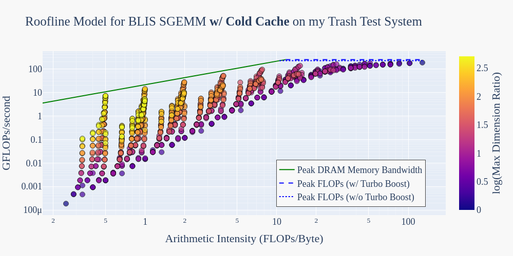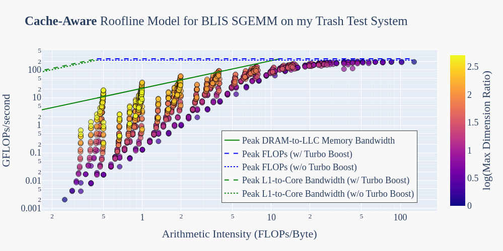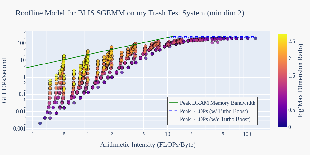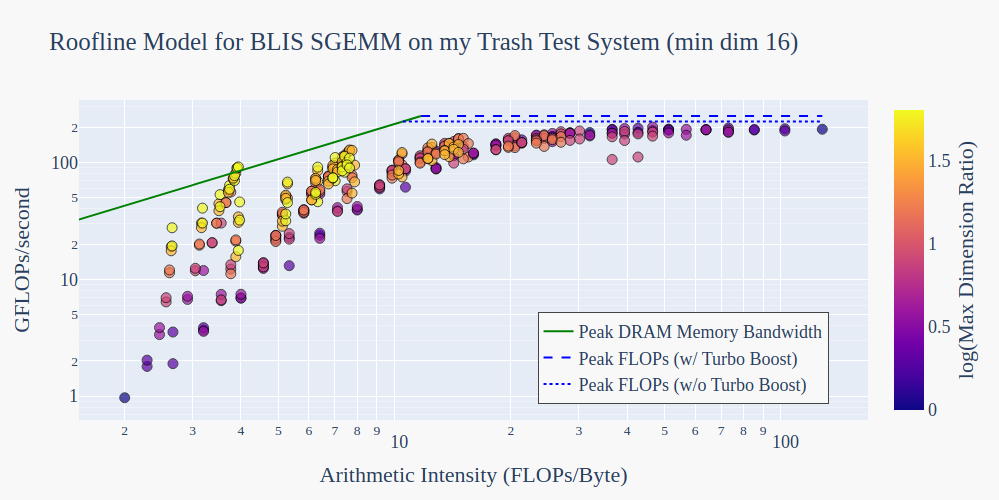 To get an idea of what’s possible on this trash test system, let’s benchmark the BLIS implementation of SGEMM and compare its performance to the machine’s roofline model.