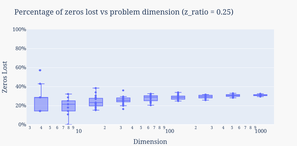 → While not losing any zeros was unlikely across all dimensions (only one observed instance for dimension 8), higher dimensions appear to have a degree of failure that is more consistent, i.e., the variance of the number of zeros lost decreases as dimension increases.
