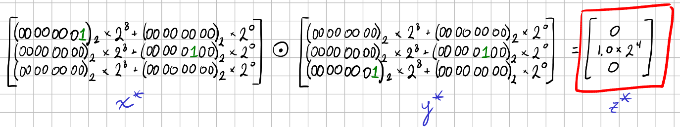 Based on my misunderstanding, I used only the ESC of 12 and the 1 carry bit, thereby miscalculating that cuBLAS would use two INT8 slices per element in the Hadamard product operands, truncating the \(1.0\times2^{-8}\) elements to zero like so: